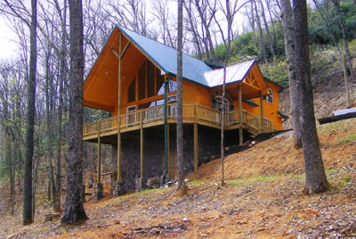 The Mountain Chalet hosts a 23 ft vaulted wood ceiling, fireplace, hardwood floors and a half-bath for guests.